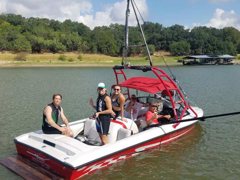 An enthusiastic bunch gathered for the Pedernales Open in Spicewood, Texas on the Pedernales River.  This year’s tournament featured a floating tower start dock, fashioned by Blake Ehlers on his pontoon boat, and several skiers looking forward to the competition.  The day started early, and the calm waters of the River yielded some strong scores.