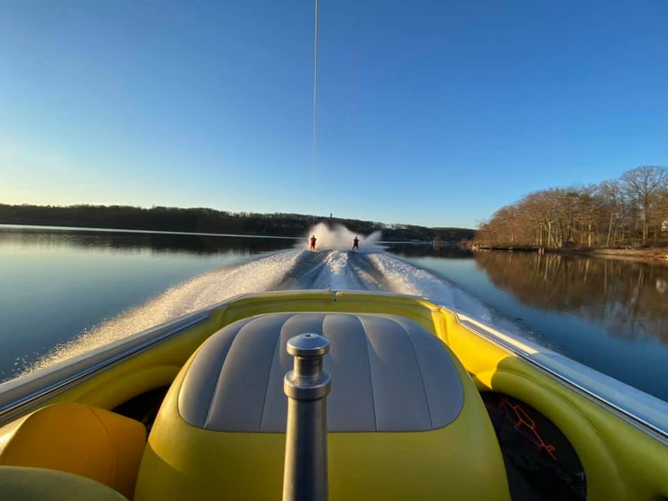 Eagle Nest Lake sits at an altitude of about 8300 feet above sea level. It was supposedly the first time anyone has skied on that lake. The boats had to be inspected before entering the water to prevent any contamination. Another consideration was getting the power and speed at that altitude. It was a chore for the 409’s.
