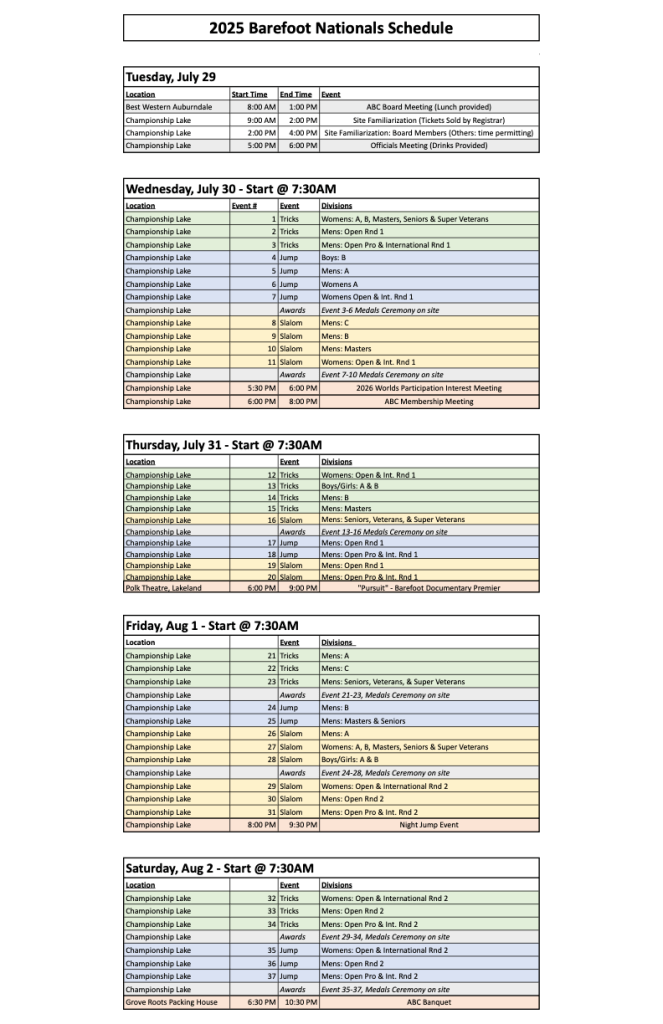 The U.S. Barefoot Water Ski Nationals are returning to Florida in 2025! The American Barefoot Club’s Southern Region and Visit Central Florida are joining forces to bring this national event to the Championship Lake in Auburndale, Florida, from July 30 through August 2, 2025.