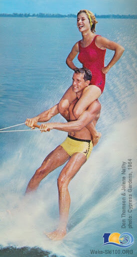 1964 Don Thomson successfully practiced with a 130 pound sandbag to convince Dick Pope, Sr (founder of Cypress Gardens) to let him try a tandem ride.
