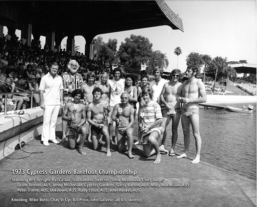 It is believed that Garry Barton was also the first water skier to ever accomplish this on his bare feet and not on a water ski! his 360 degree whirl amazed the crowds during the 1973 ski show at the Moomba Water Ski International in Melbourne, Australia.