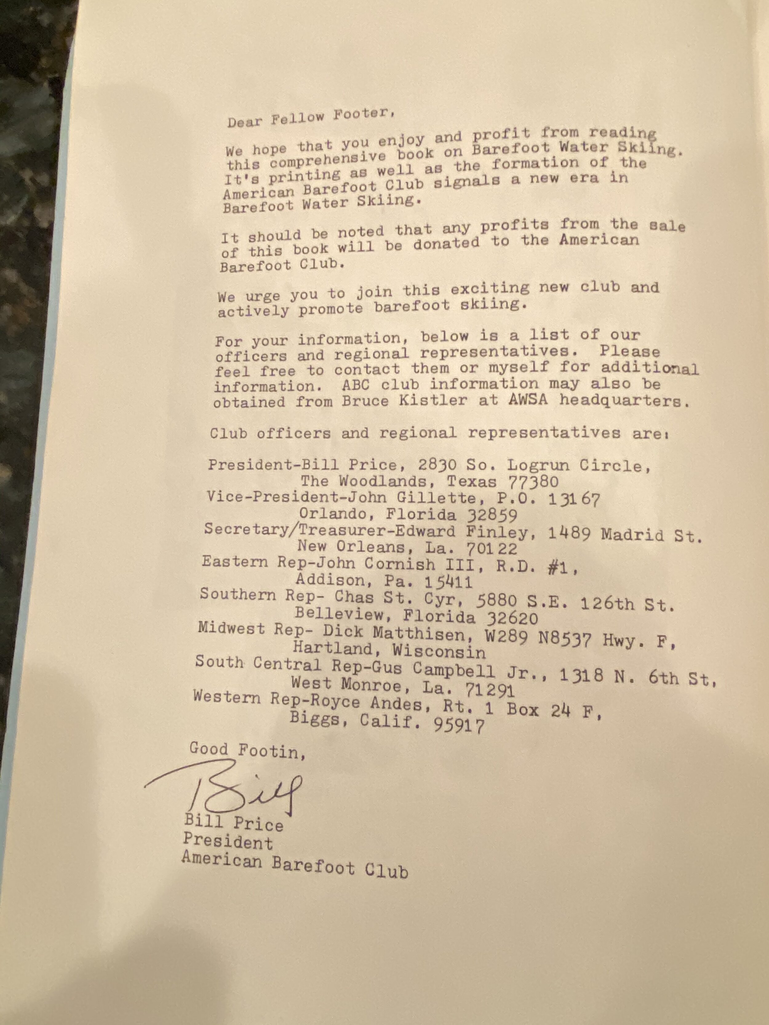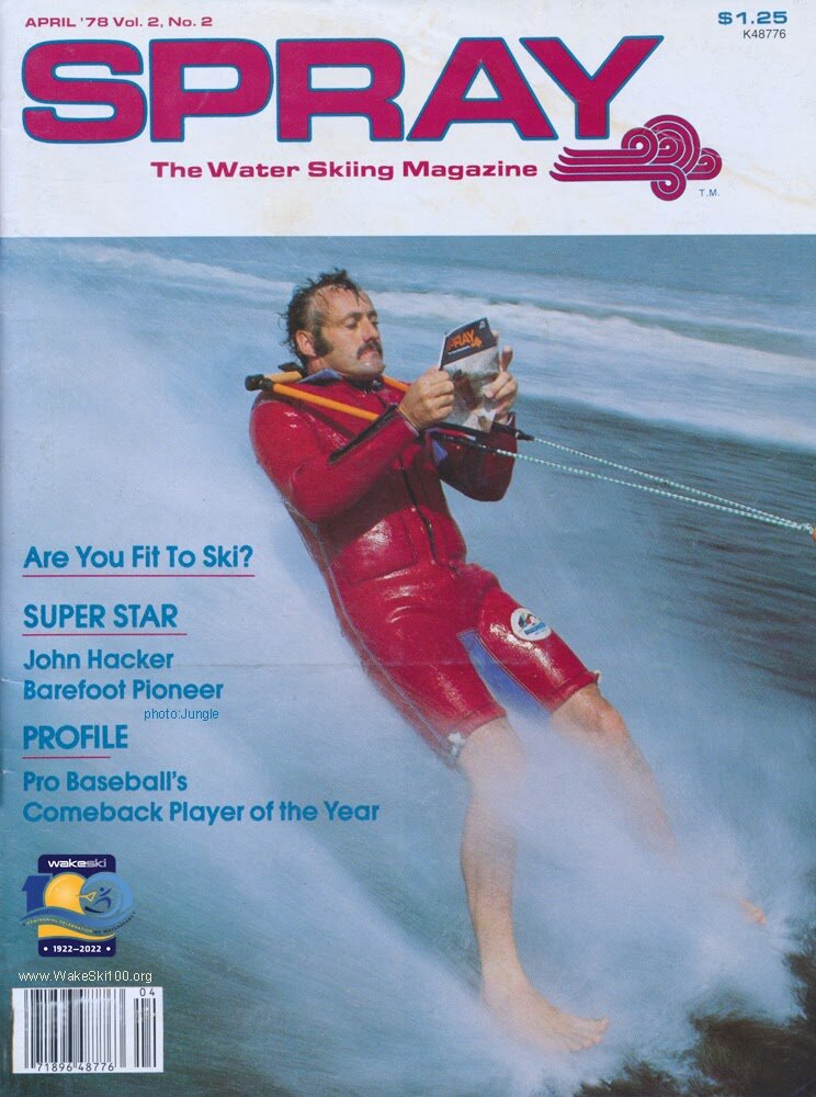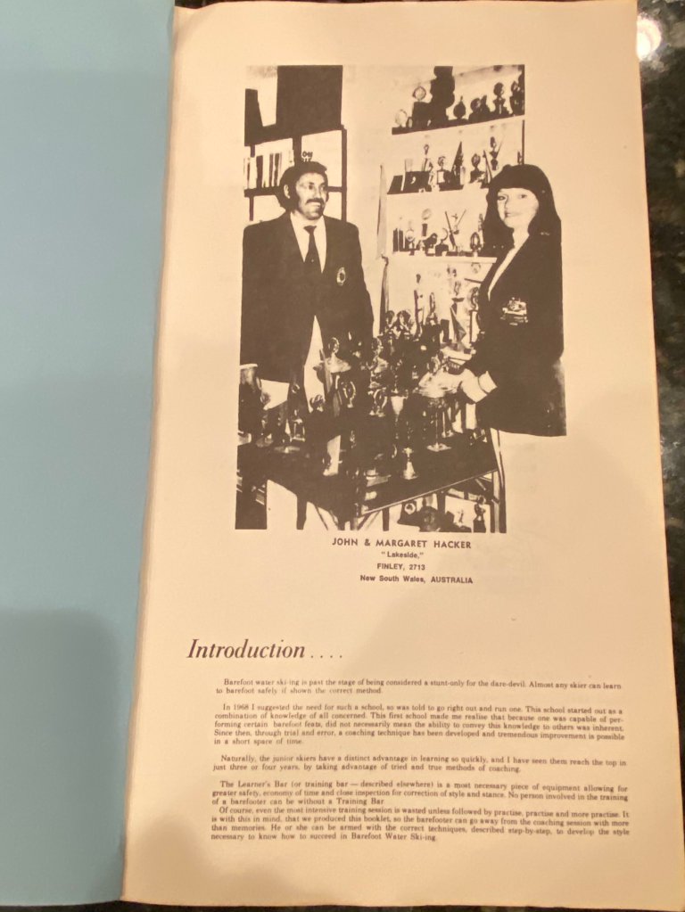 1979 John Hacker, Australian Barefoot Ambassador, coach and barefooter publishes a “Step-by-Step Barefoot Water Skiing” how to book using stick figures in the illustrations. ( 11” x 17” paperback) A very interesting and helpful book at the time. It was done in cooperation and distribution with the American Barefoot Club.