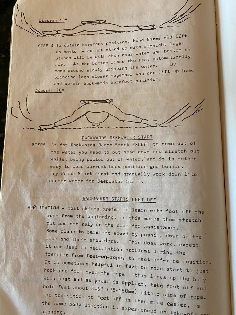 This was in very early 1969. (He also used rubber thongs as well as a cricket box that he wore in the groin of his wetsuit to lessen the pain whist perfecting this new start method)The water ski world was totally amazed when he performed this new backwards start method in public for the very first time at the Australian Barefoot Water Ski Championships at Manly Dam in Sydney, Australia on May 03, 1969.