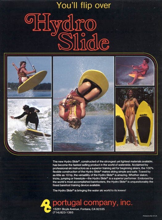 1979 A new product the Hydroslide kneeboard is successfully promoted by Danny Churchill. Early advertising for the board (and other brands that follow) almost always include promotions regarding using it as a training device to learn how to ride. This very early ad for Hydroslide features barefoot speed world record holder Lee Kirk. Kneeboards are the hottest ride in towed water sports in the 1980s, and thousands of people use their kneeboard to learn how to barefoot for the first time.