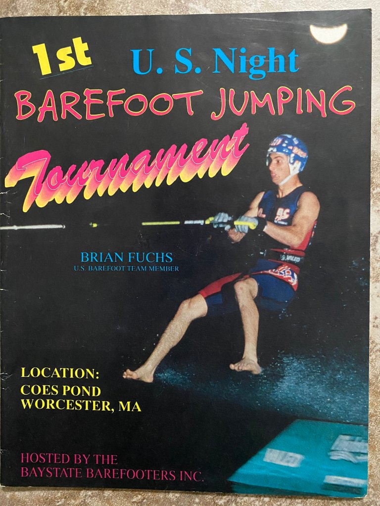 1987 Ron Scarpa jumps out of a helicopter 67 feet above the water and barefoots away for the Guinness Book of World Records at the 1987 US Barefoot Nationals, Owego, NY. It was covered and televised by the Guinness Records TV Show